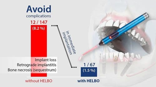 Inserarea imediată a implantului cu încărcare imediată devine mai predictibilă cu terapia HELBO, în special în alveolele infectate.